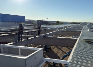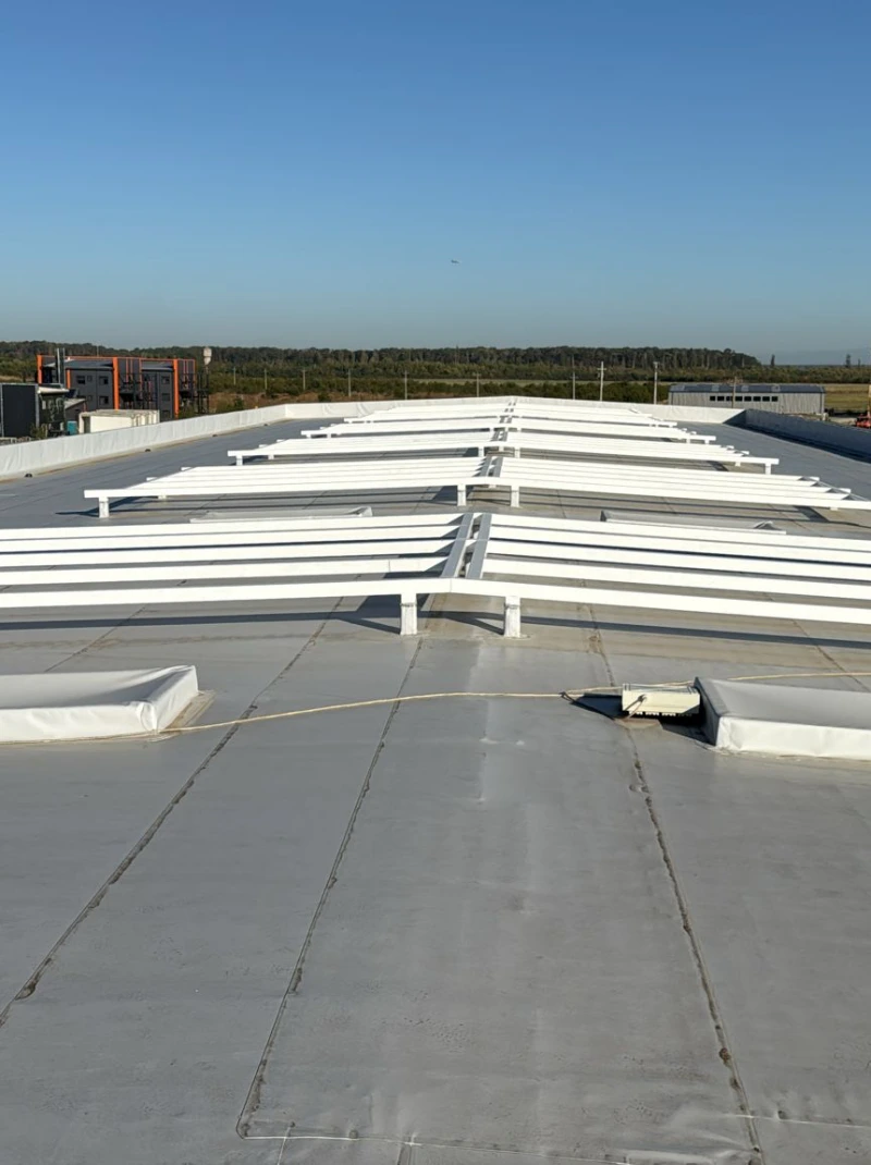 Lucrări hale depozitare Otopeni – Montaj acoperiș complet cu membrană PVC Sika 20G